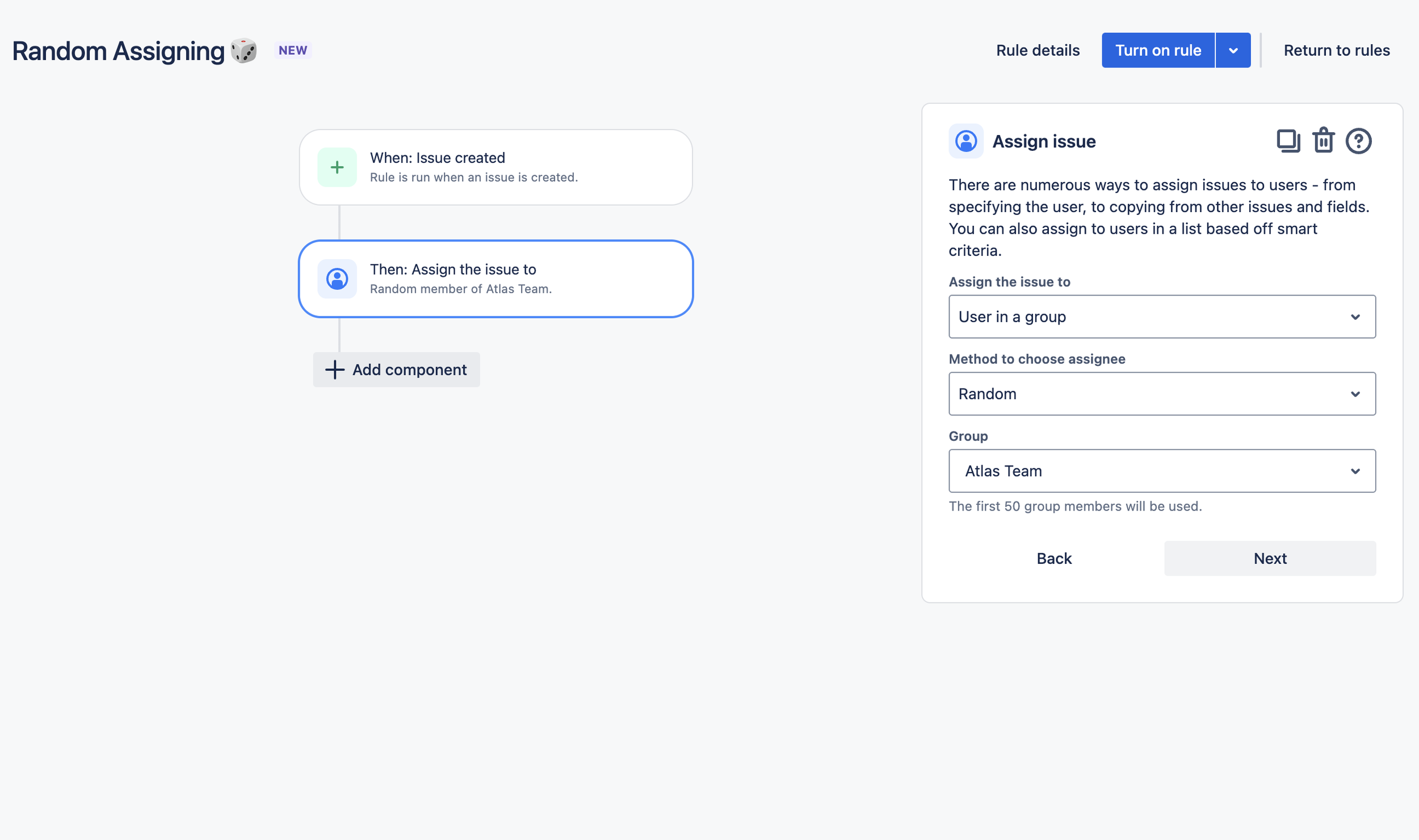 Esta regla selecciona un miembro del equipo de manera aleatoria y le asigna la tarea, asegurando que nadie elija manualmente a los responsables.