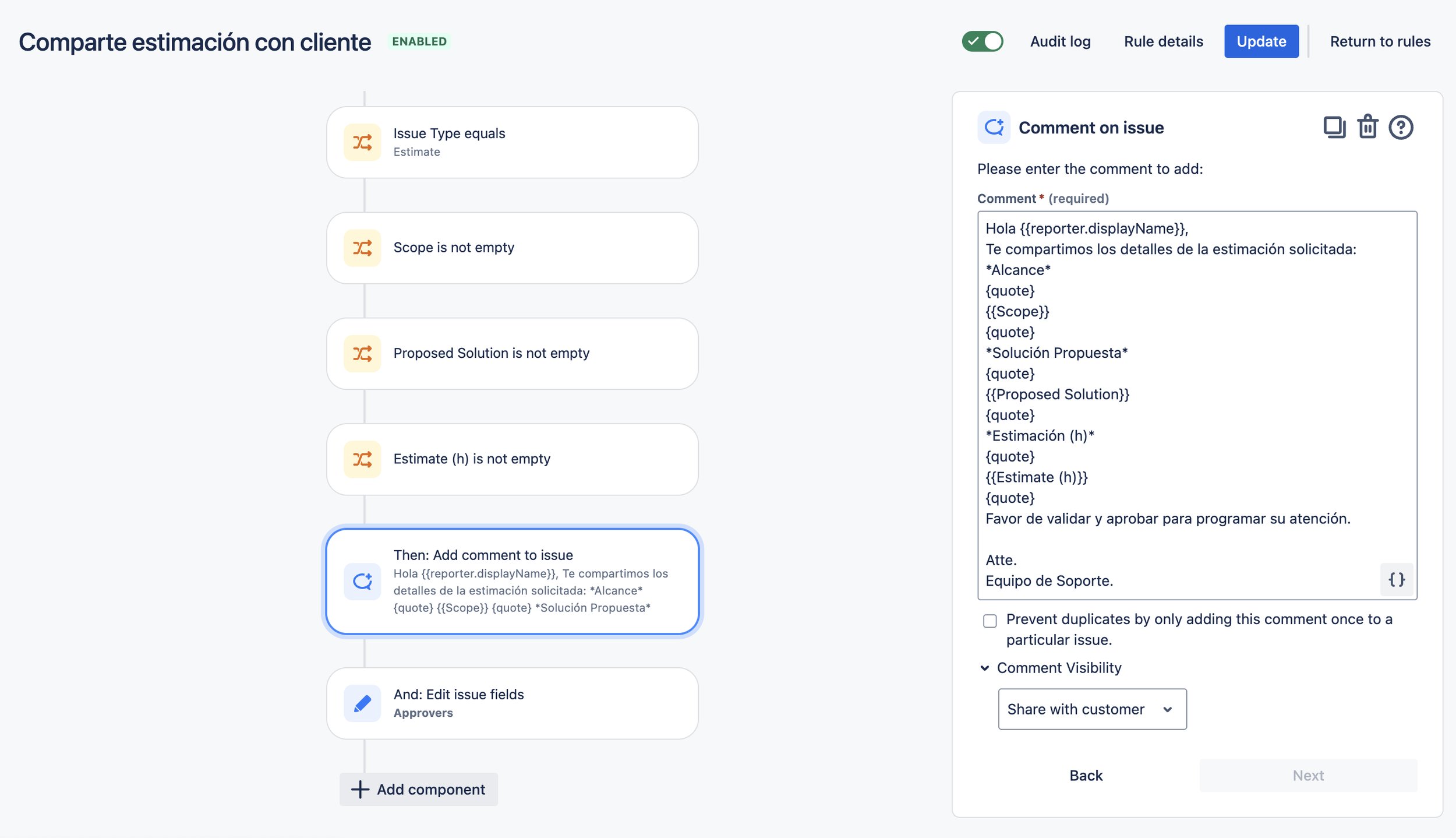 Antes de iniciar cualquier tarea, es fundamental que el cliente apruebe las horas estimadas. Jira Service Management te permite implementar un flujo de aprobación automatizado: